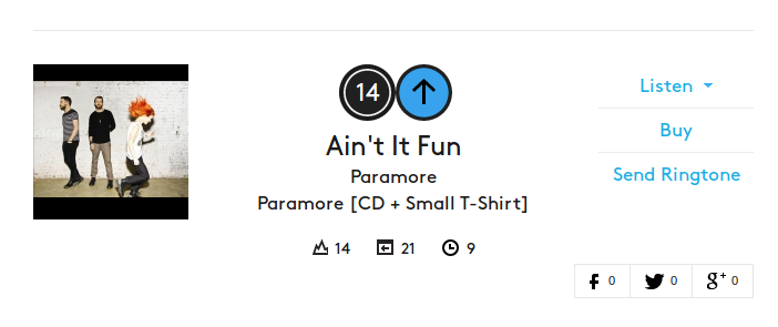 A nova tabela desta semana da HOT 100 da Billboard foi hoje revelada e o single dos Paramore está em 14º (na semana anterior encontrava-se em 21º) e é a música dos Paramore com mais sucesso nos charts. Os Paramore nunca tiveram uma música no top 20 da Hot 100 da Billboard e esta semana "Ain't It Fun" encontra-se no Top 15.